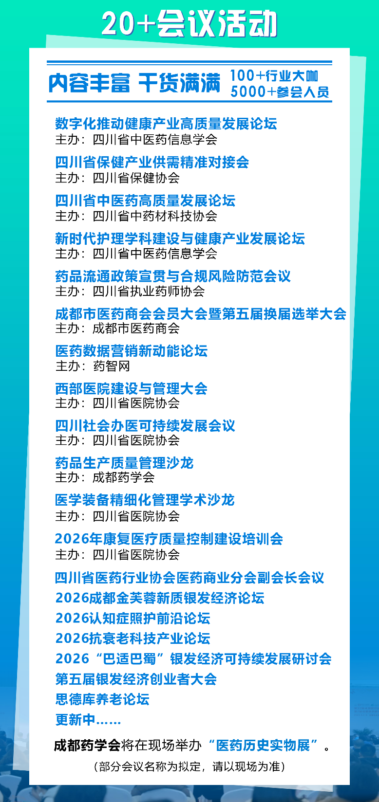 博览会期间,将举办超过20场高水平的专题交流会议活动,包括“数字化推动健康产业高质量发展论坛”、“新时代护理学科建设与健康产业发展论坛”、“四川省保健产业供需精准对接会”、“医药数据营销新动能论坛”、“四川省中医药高质量发展论坛”、“药品流通政策宣贯与合规风险防范会议”、“药品生产质量管理沙龙”、“成都市医药商会会员大会”“医学装备精细化管理沙龙”、“四川社会办医可持续发展会议”等。